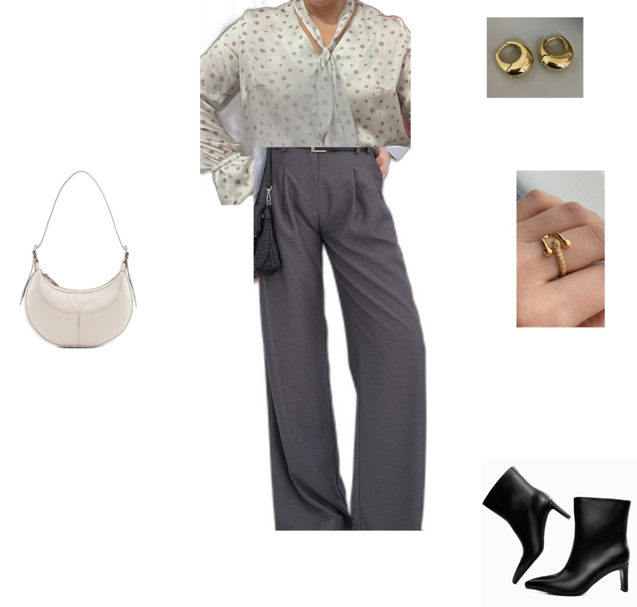 Простой и при этом стильный образ для работы, особенно если в офисе жарко. Классические брюки с защипами дополняет нежной блузой из вискозы с галстуком. Галстук можно завязать в бант, либо ленты обернуть вокруг шеи и завязать на узел.