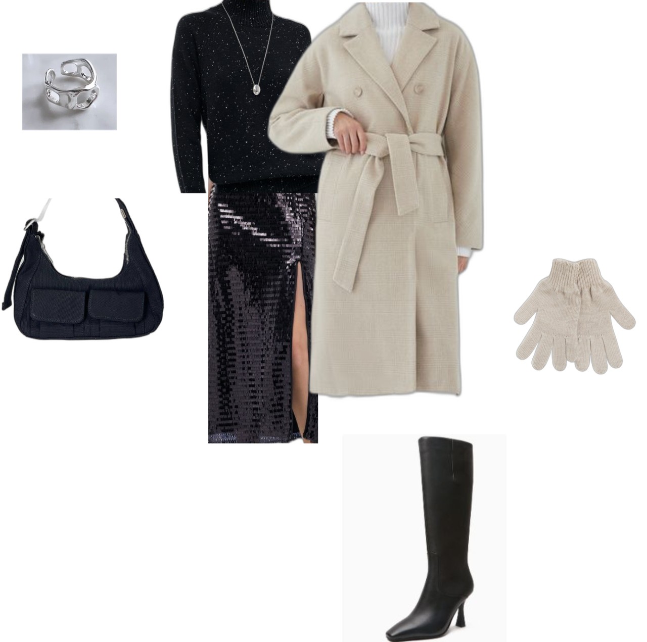 Юбку с пайетками для повседневно-нарядного образа сочетайте с водолазкой или джемпером, добавьте украшения, сумку-багет и базовое пальто.